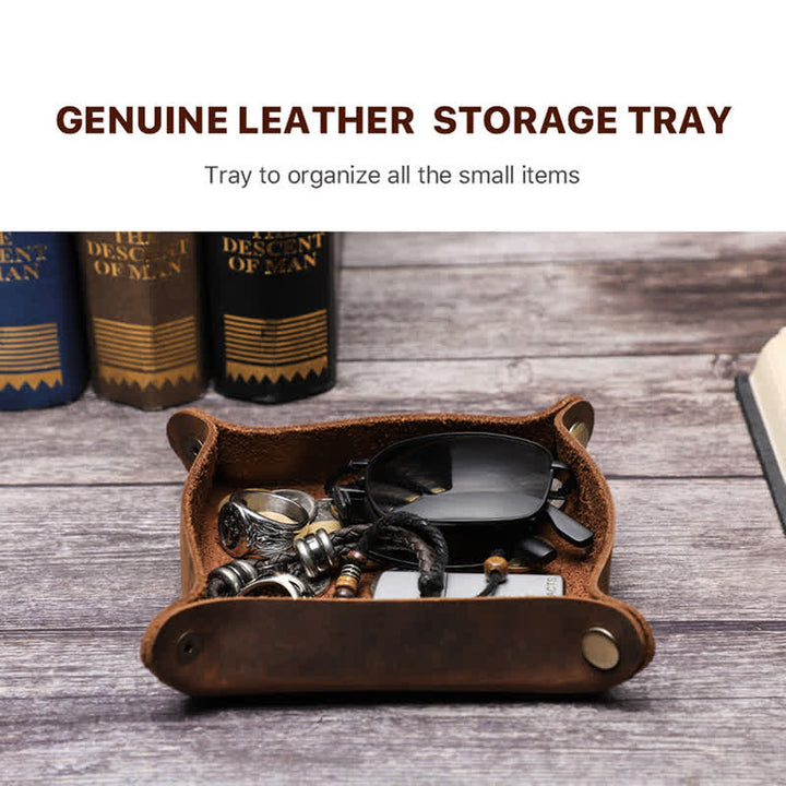 - Fabricada en auténtica piel de vacuno, nuestra bandeja de valet aporta un toque de elegancia y durabilidad a su hogar u oficina. La textura natural del cuero irradia una sofisticación atemporal que complementa cualquier decoración.
