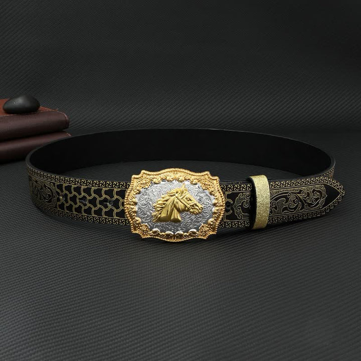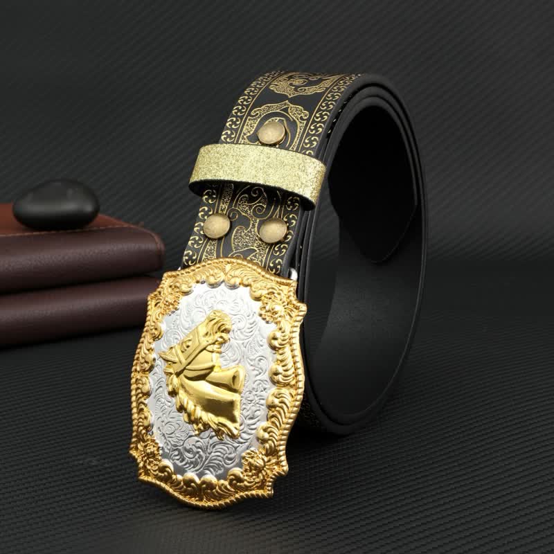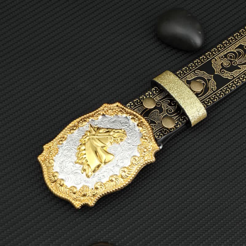 Este cinturón con hebilla de caballo dorada y patrón floral en relieve bronceado, está hecho de un patrón de flores retro que es de percepción estéreo, lo que lo hace llamativo y con estilo vintage.