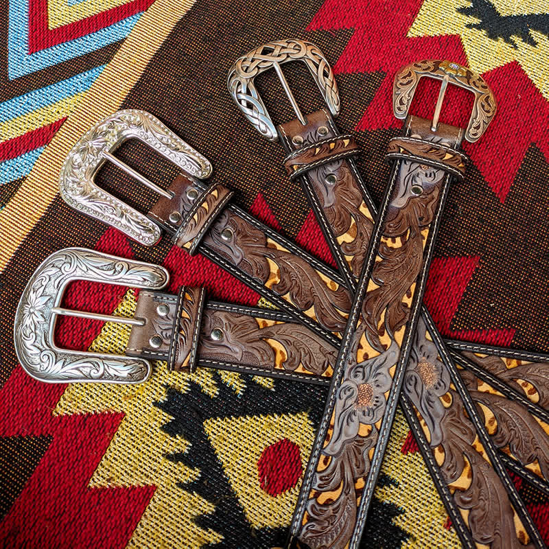 Este cinturón de inspiración occidental, con estampado floral tallado y hebilla plateada, le da el toque perfecto a cualquier par de jeans. ¡Crea un estilo casual y elegante!