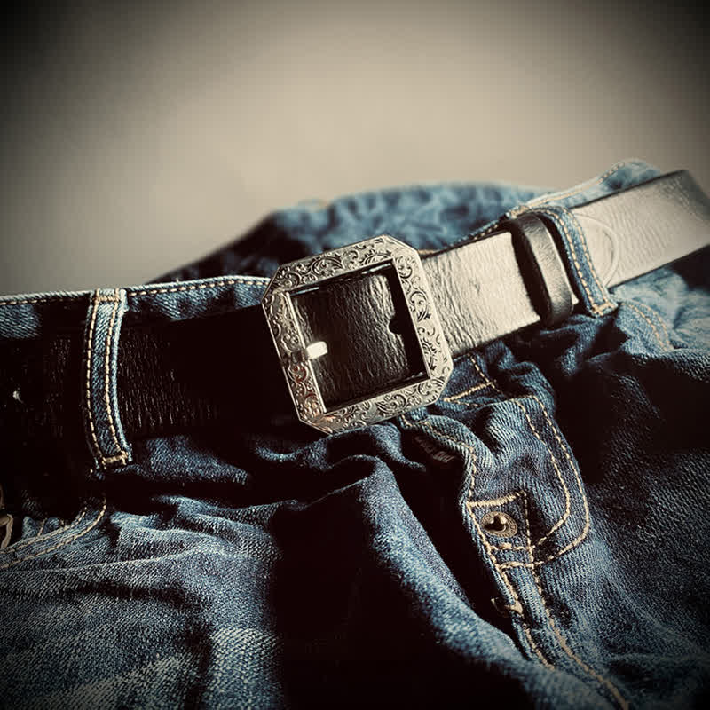 Cinturón de cuero para pantalones con hebilla grabada con flores cuadradas