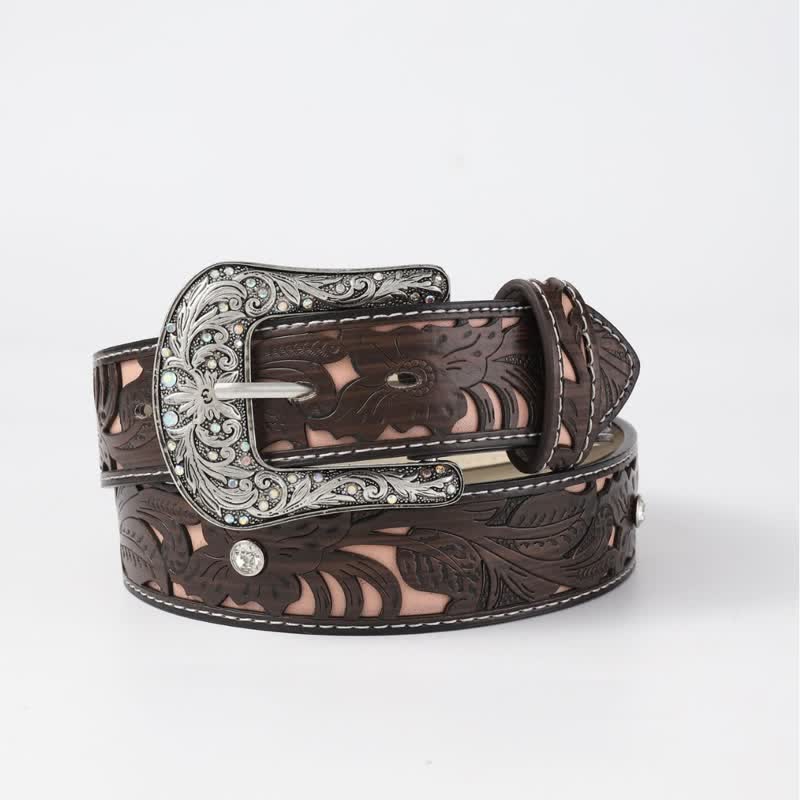 Este elegante cinturón es una gran incorporación a tu guardarropa. La correa de cuero presenta un patrón de flores recortadas en color café y la hebilla tiene incrustaciones de diamantes de imitación. Se recomienda comprar una talla más grande que la de los pantalones.
