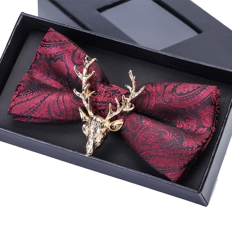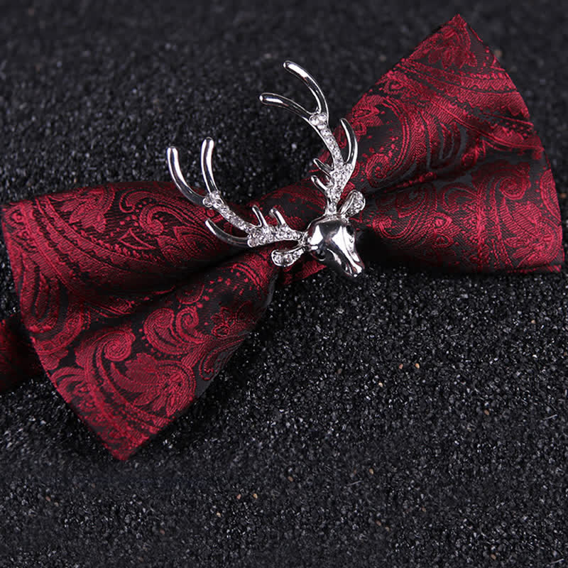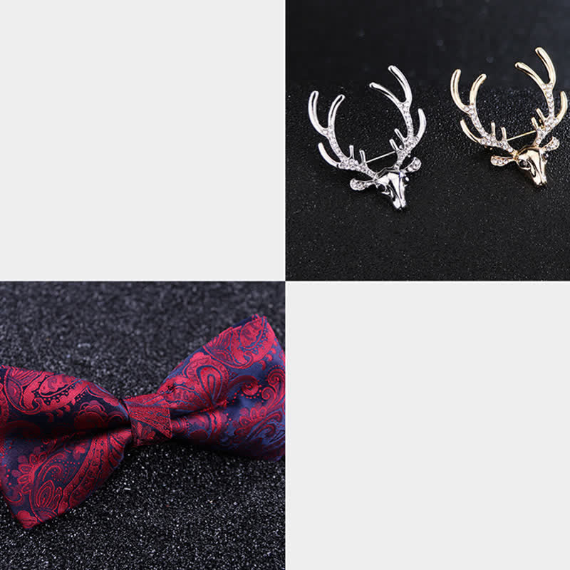 - Agrega un toque festivo a tu atuendo navideño con esta pajarita con cabeza de alce con estampado navideño de cachemira.