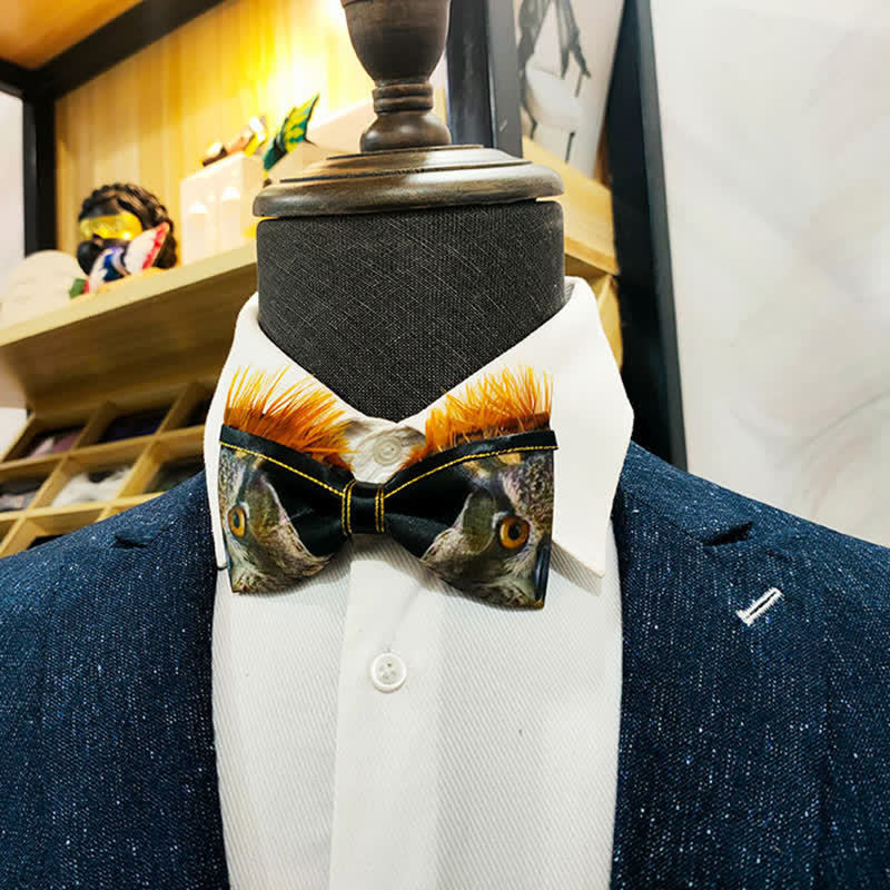 - La pajarita de moda está diseñada con un divertido estampado de cabeza de búho.