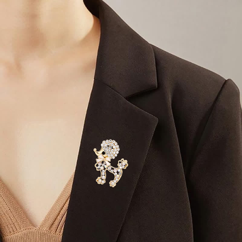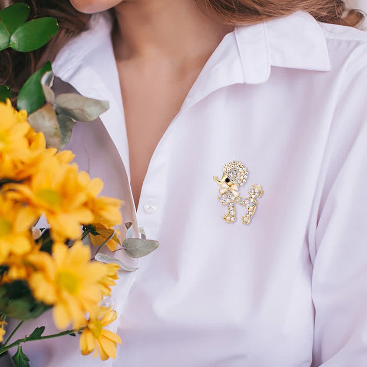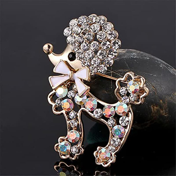 - Un broche en forma de cachorro lleno de iridiscencia y brillo. Adornado con brillantes diamantes de imitación.