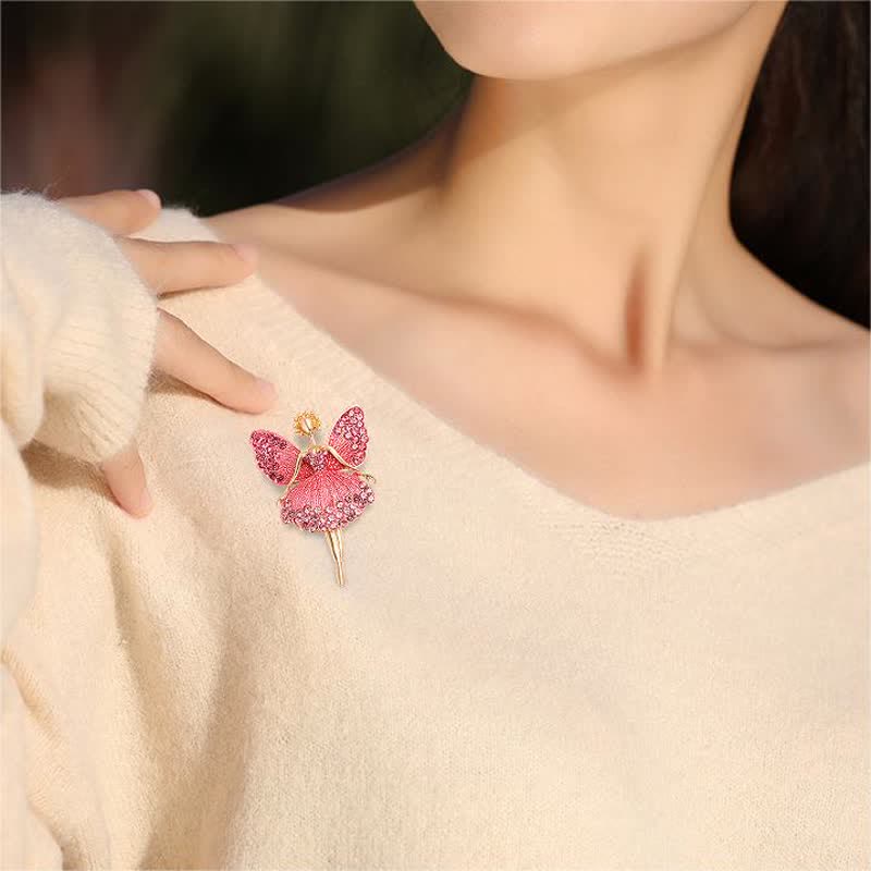 - Este broche de metal presenta a una bella dama con un vestido rojo sosteniendo un paraguas negro.