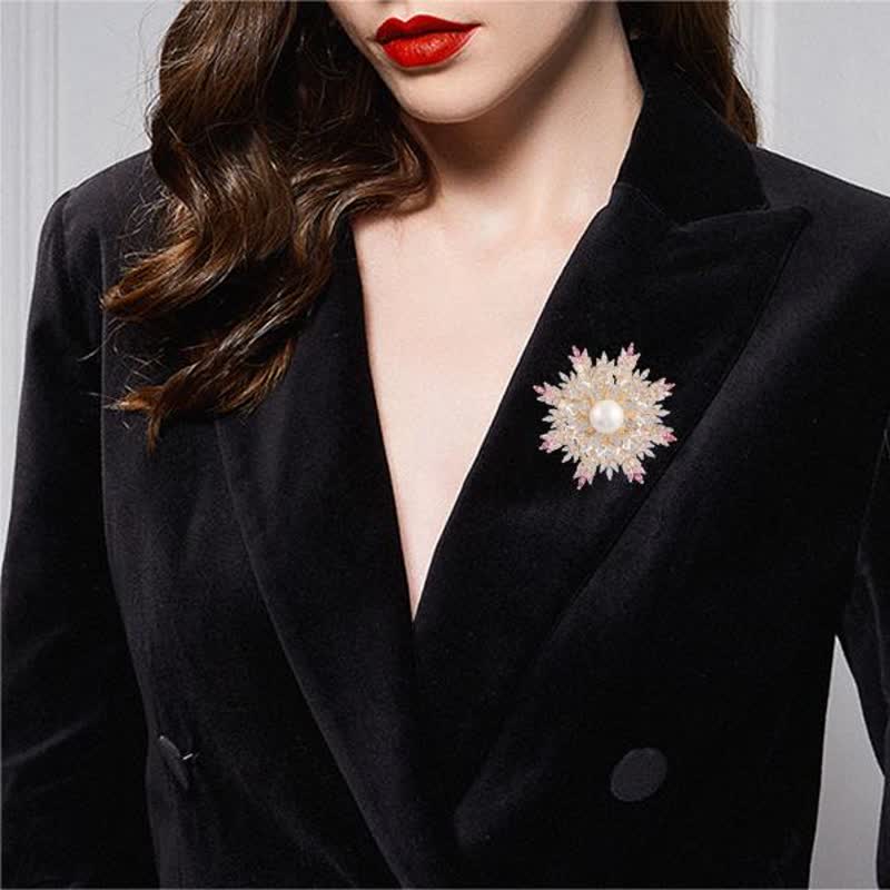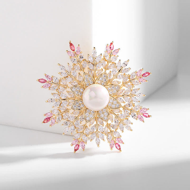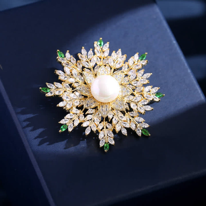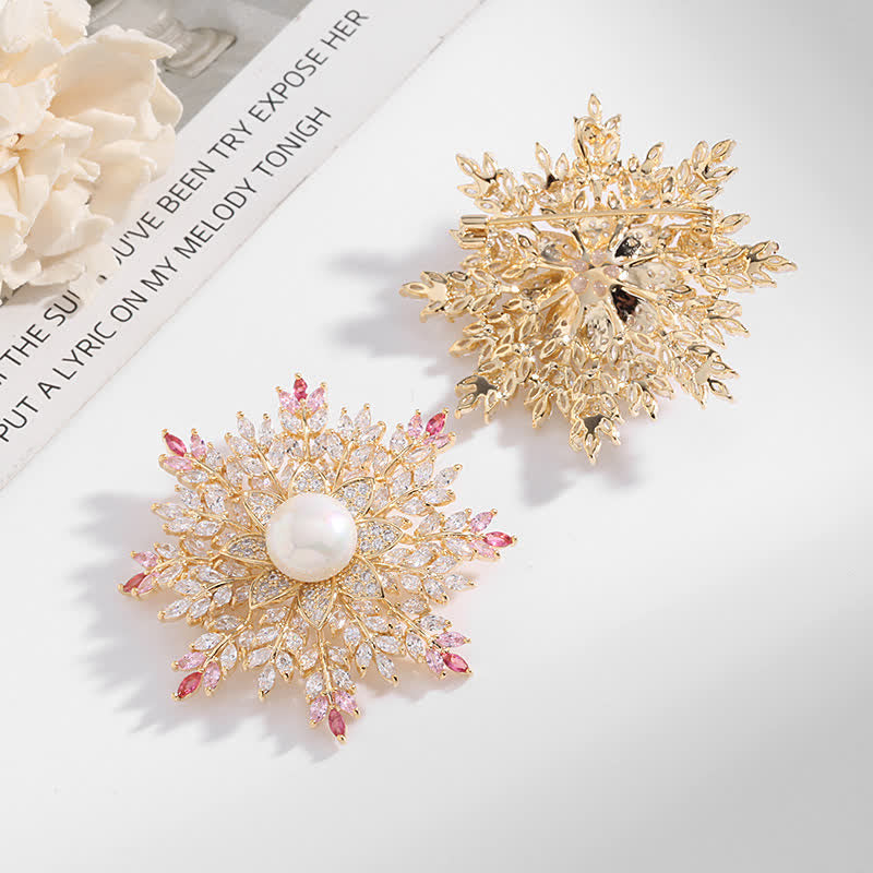 - Con diseño de copo de nieve, centrando una perla redonda, adornado con diamantes redondos y ramas de oro texturizado.