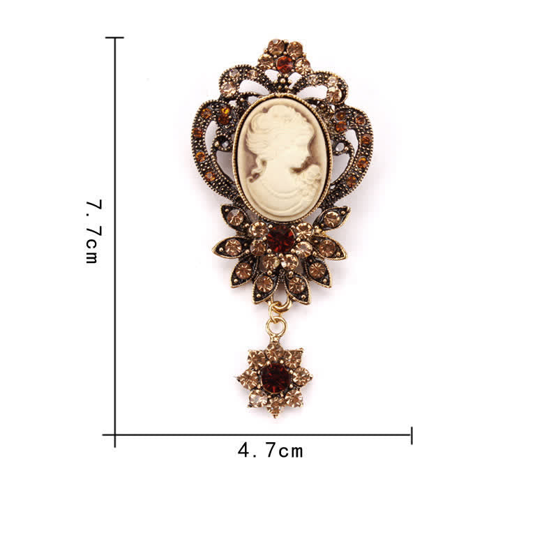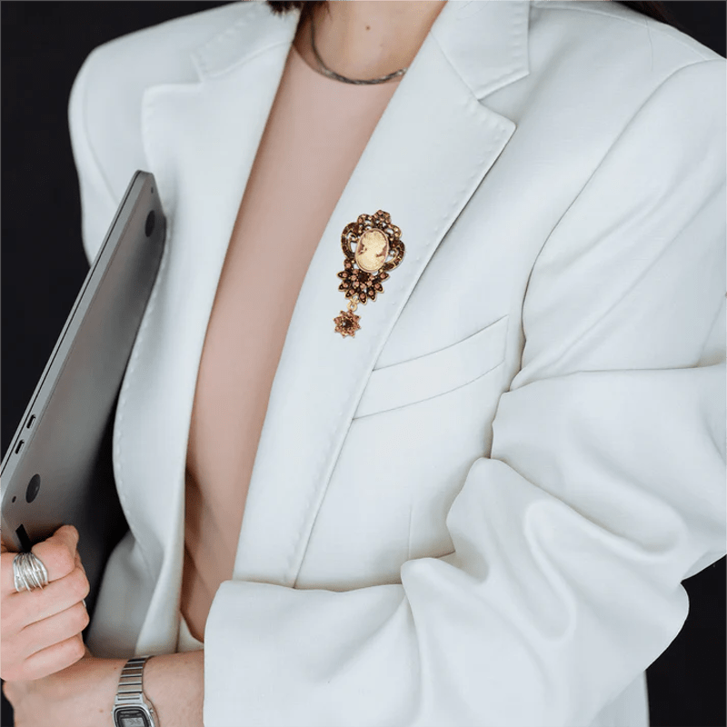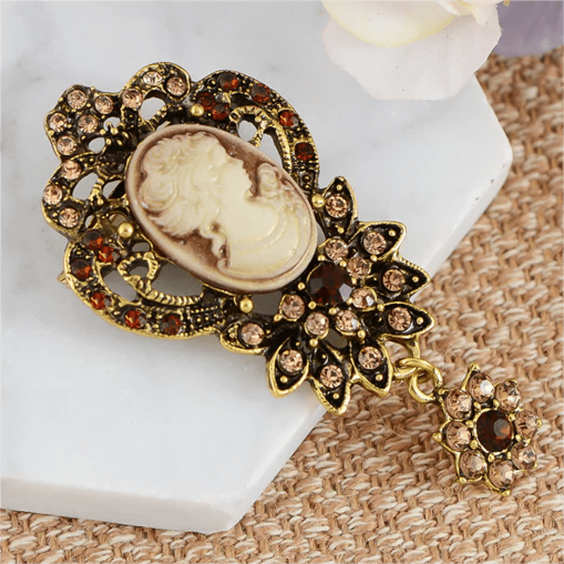 - Para los amantes de los camafeos clásicos, este broche de flor con camafeo antiguo es la opción ideal.