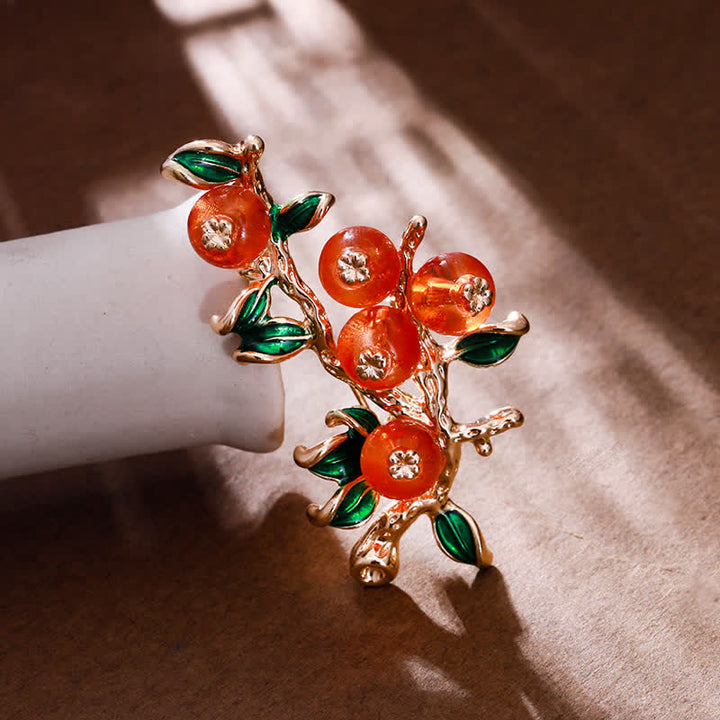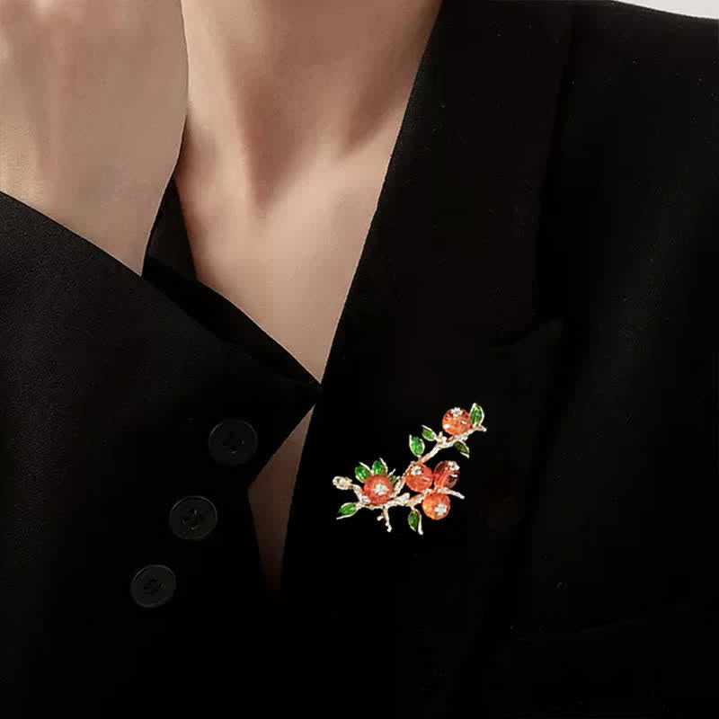 - Un hermoso broche en forma de caqui añade sofisticación y elegancia a cualquier atuendo.