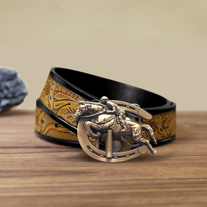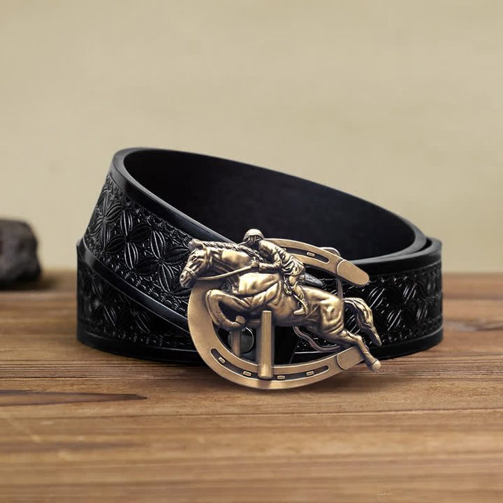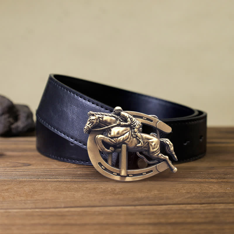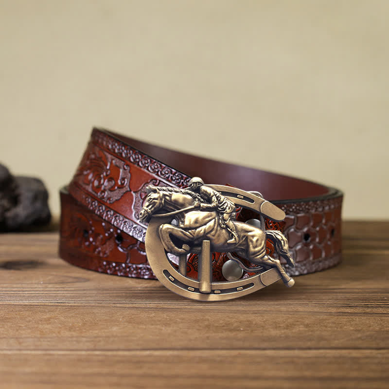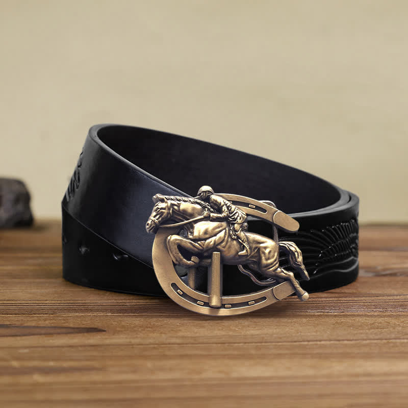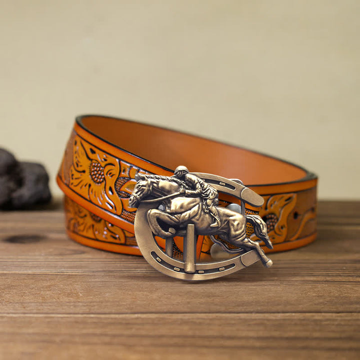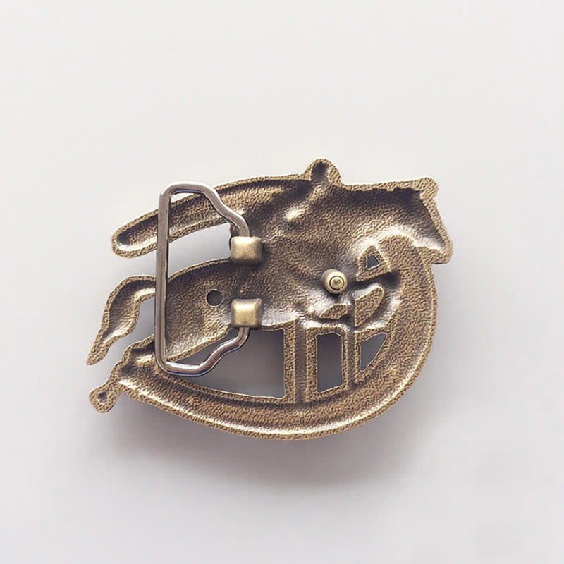 ¡A las carreras! El caballo y el jinete están esculpidos y colocados en un marco tipo herradura de carreras. Es una hebilla tridimensional con bonitos detalles.