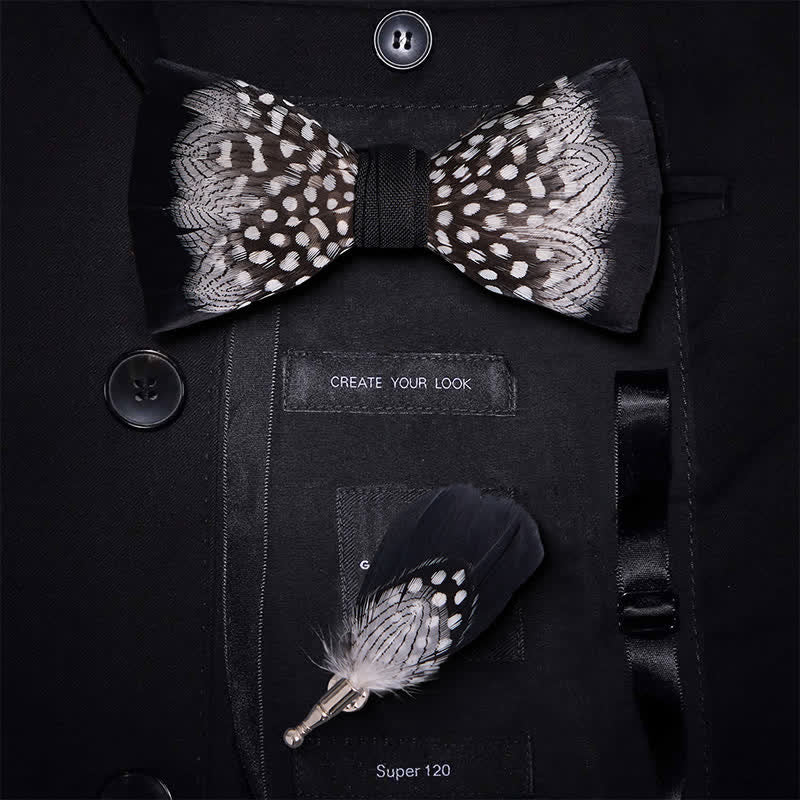 - Características: La adición de plumas de lunares blancos entrelazadas en el fondo negro agrega un elemento inesperado de contraste e interés, haciendo que esta pajarita se destaque del resto.