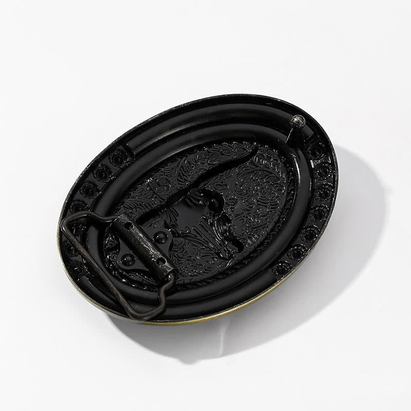 La clásica cabeza de toro de cuernos largos grabada y el patrón de flores, los diamantes de imitación brillantes y las piedras burdeos y azules añaden un estilo bohemio, puede combinar con cualquier jeans y pantalones casuales.