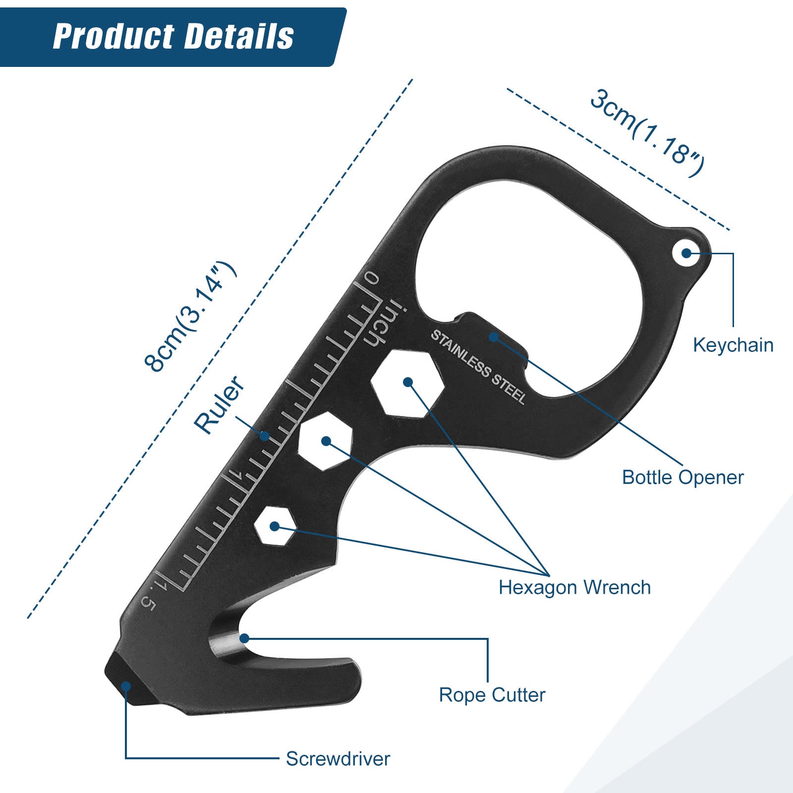 - Funciones: Linterna LED / Bolígrafo / Rompevidrios / Destornillador / Encendedor