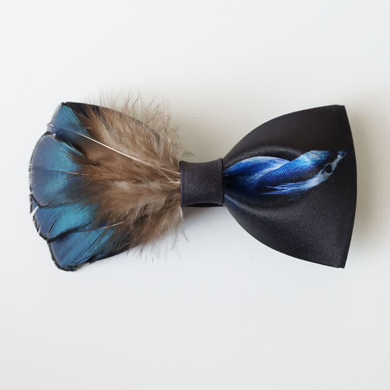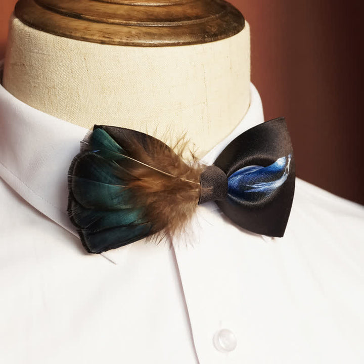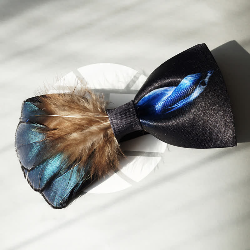 - Características: Con plumas de cola que se extienden a lo largo de la pajarita blanca, este llamativo accesorio para hombre hará que todos hablen.