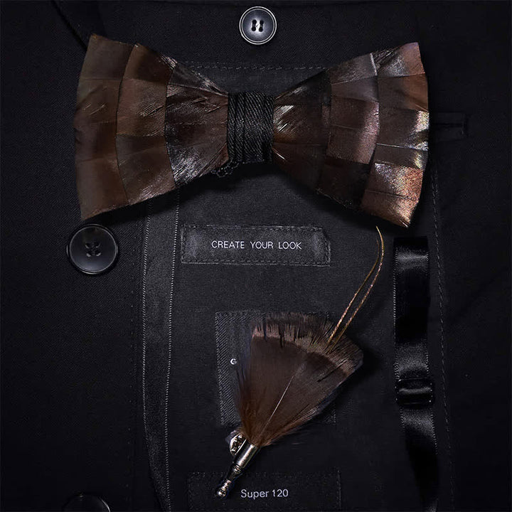 ¿Buscas una alternativa a la clásica pajarita de seda negra? No busques más. Esta pajarita está confeccionada con plumas de color cobre claro y una vuelta central de grosgrain negro para un look sutil y discreto.