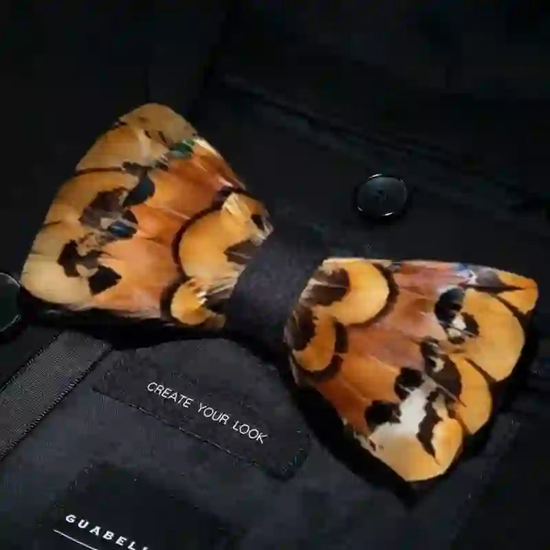 - Características: Esta impresionante pajarita neutra, de color beige combinado con plumas de faisán doradas, crea un diseño fuerte y angular.