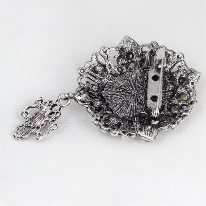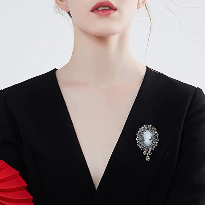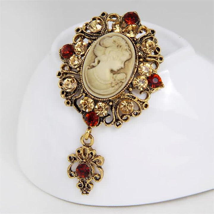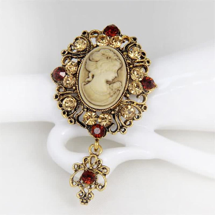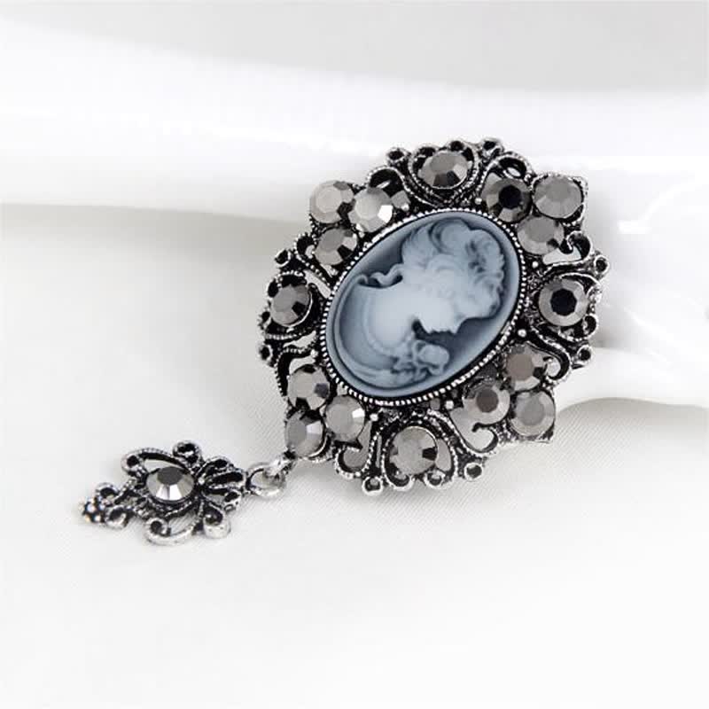 - Camafeo de inspiración vintage con camafeo de doncella y diamantes de imitación de colores.