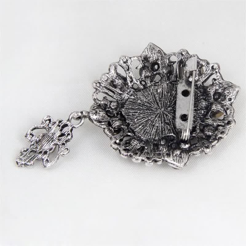 - La parte llamativa es el pequeño colgante en forma de lágrima que cuelga en la parte inferior del broche, elegante y animado.