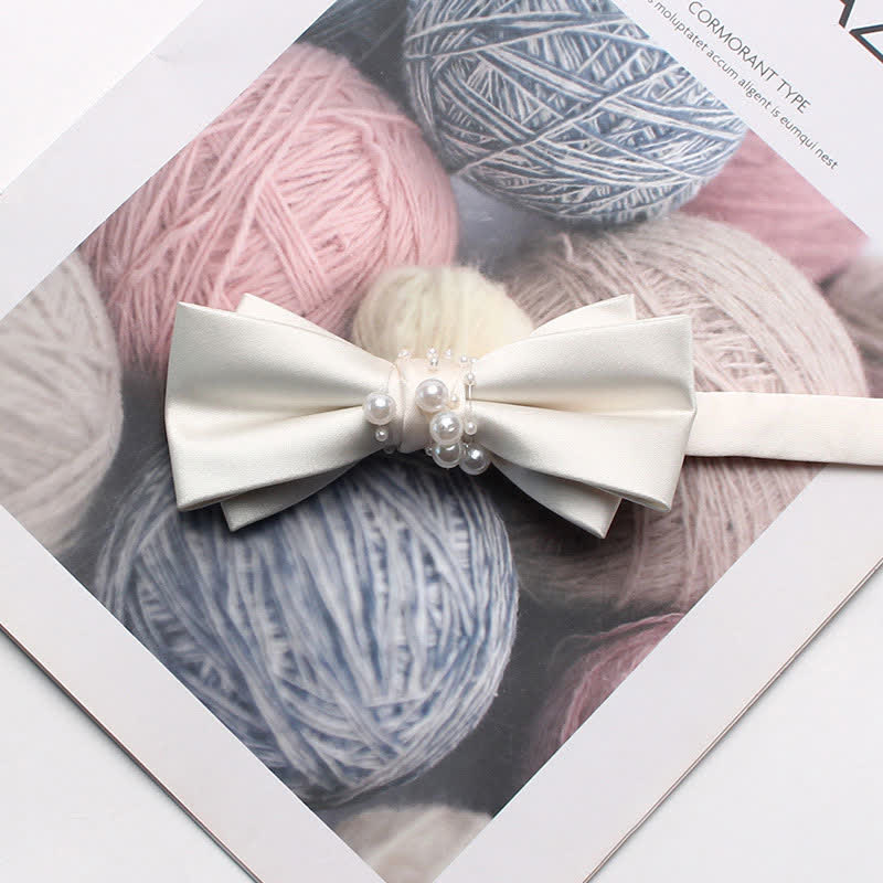 - El centro de la elegante pajarita de marfil está adornado con bonitas perlas de distintos tamaños.