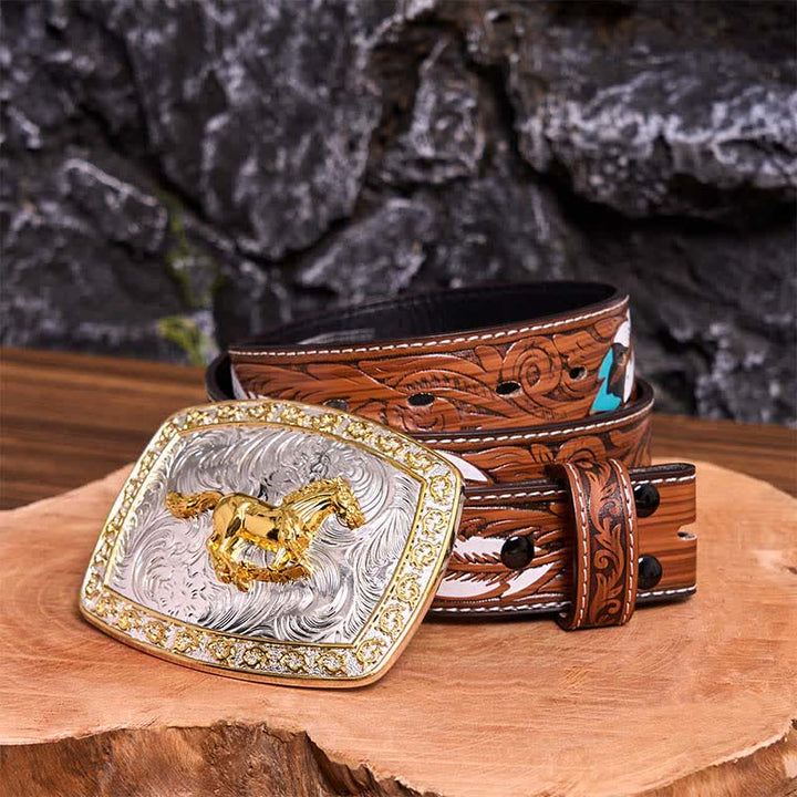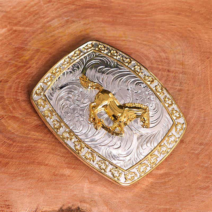 Cinturón de cuero con hebilla grande DIY de caballo corriendo dorado y plateado