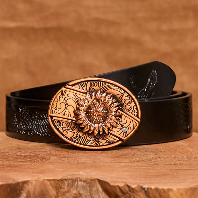 Cinturón de cuero con navaja plegable oculta con diseño de girasol en bronce rojo para hombre - Girasol - Cinturón de águila negra en relieve - 42 - image 7