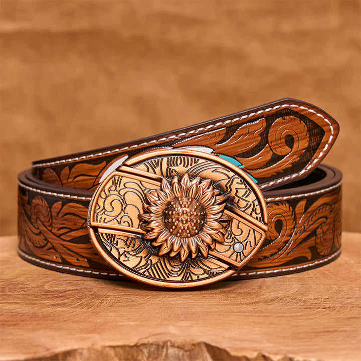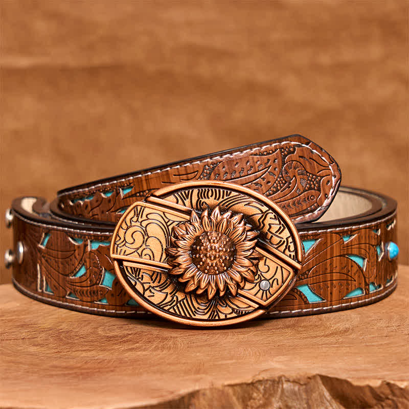 Cinturón de cuero con navaja plegable oculta con diseño de girasol en bronce rojo para hombre - Girasol - Cinturón tallado en turquesa - 42 - image 6