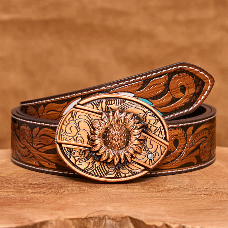 Cinturón de cuero con navaja plegable oculta con diseño de girasol en bronce rojo para hombre - Girasol - Cinturón tallado marrón - 42 - image 8