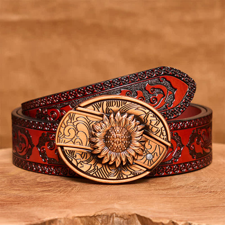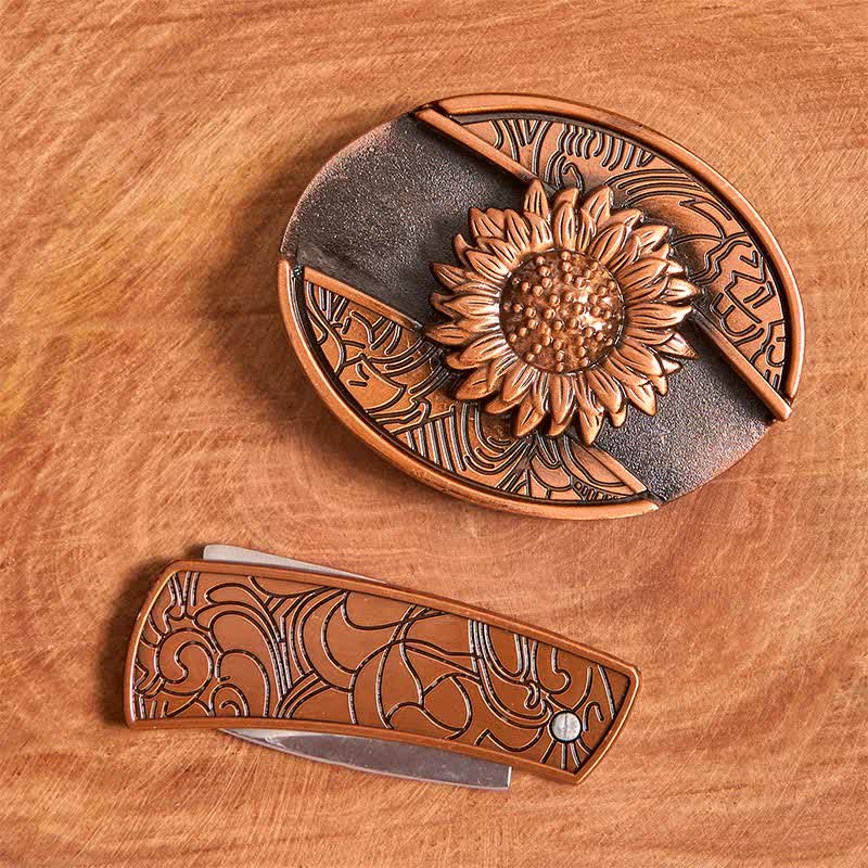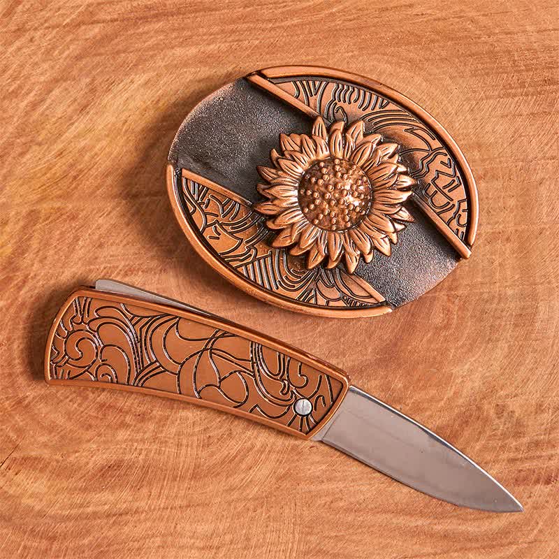 Cinturón de cuero con navaja plegable oculta con diseño de girasol en bronce rojo para hombre