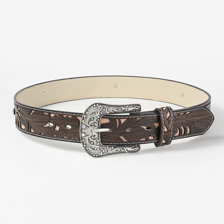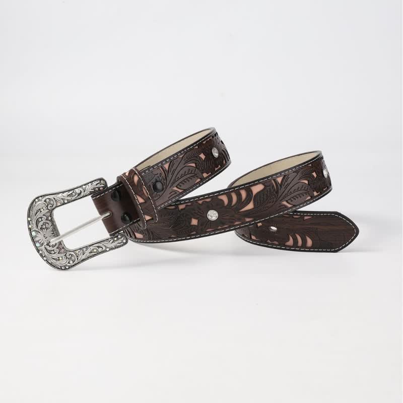 Este elegante cinturón es una gran incorporación a tu guardarropa. La correa de cuero presenta un patrón de flores recortadas en color café y la hebilla tiene incrustaciones de diamantes de imitación. Se recomienda comprar una talla más grande que la de los pantalones.