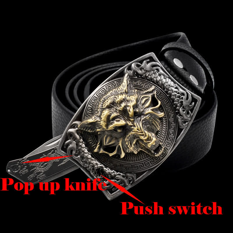- Mejore su protección personal con nuestro fantástico cinturón de cuero con cabeza de lobo dorado.