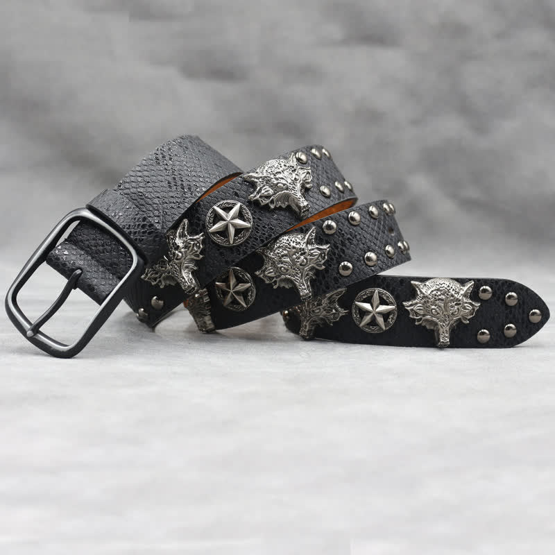 Cinturón de cuero con estampado de piel de serpiente negra y remaches de cabeza de lobo en plata antigua