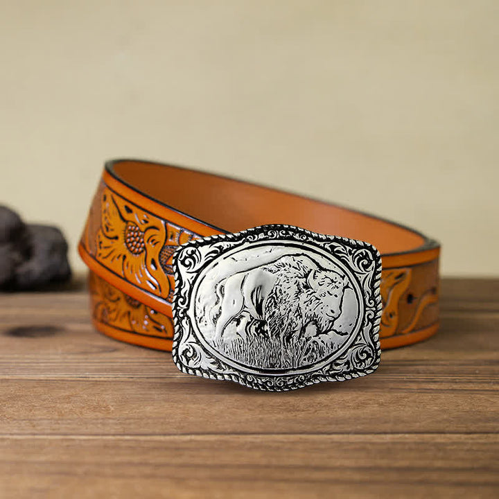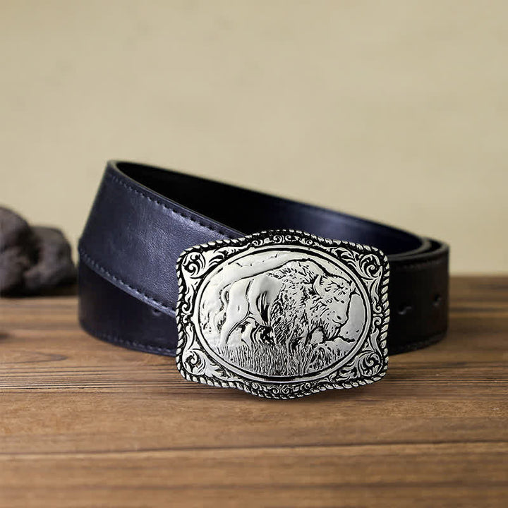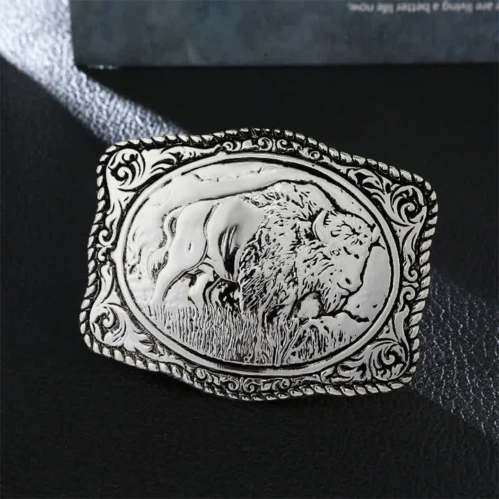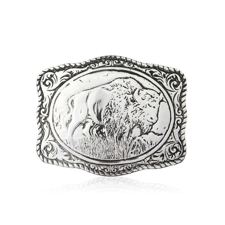Esta hebilla tiene forma de rectángulo plateado y un borde de cuerda decorado con un búfalo en el campo. Será un complemento llamativo para su cinturón.