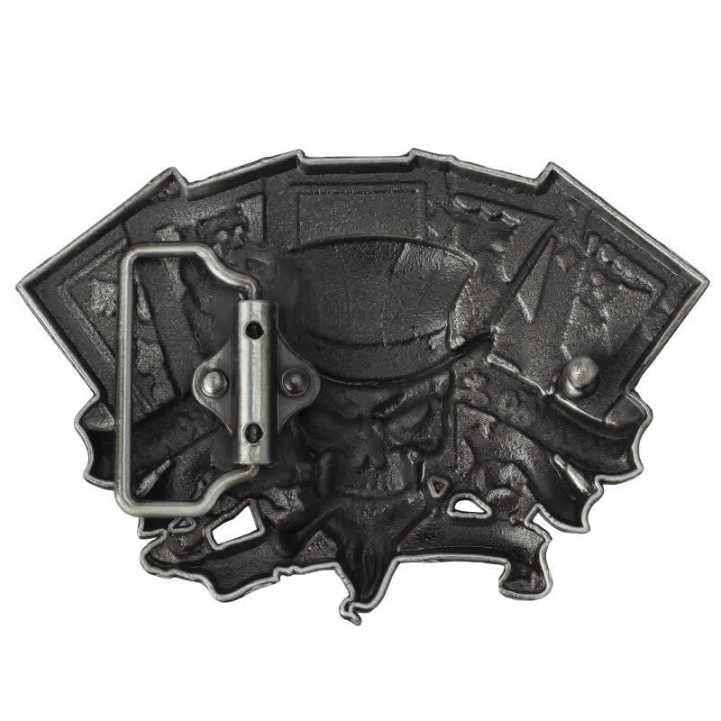 Esta hebilla de cinturón presenta una calavera con perilla fumando un cigarro y un sombrero de copa con la bandera estadounidense rodeado de una pancarta con las palabras "Vive para ganar". Detrás de él hay 5 naipes con forma de esqueleto.