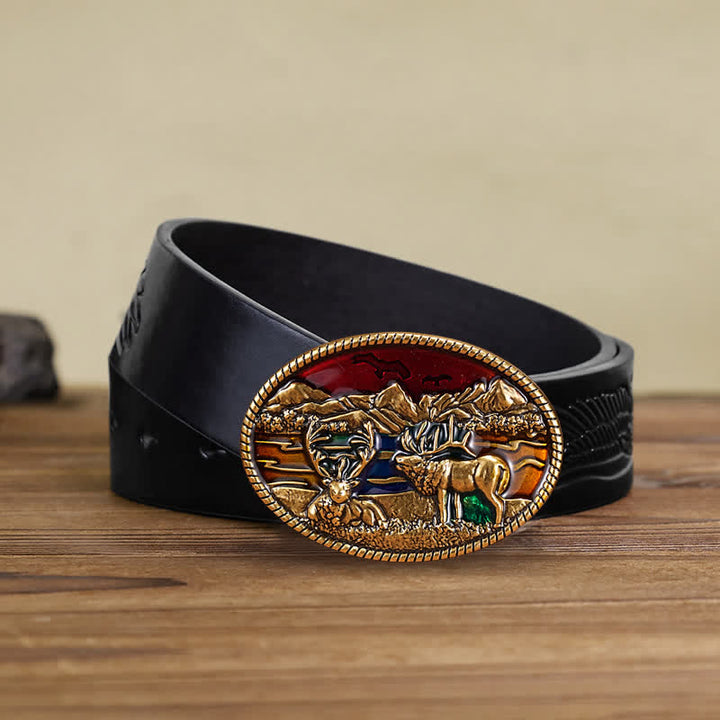 Cinturón de cuero con hebilla de ciervo salvaje esmaltado para hombre hecho a mano