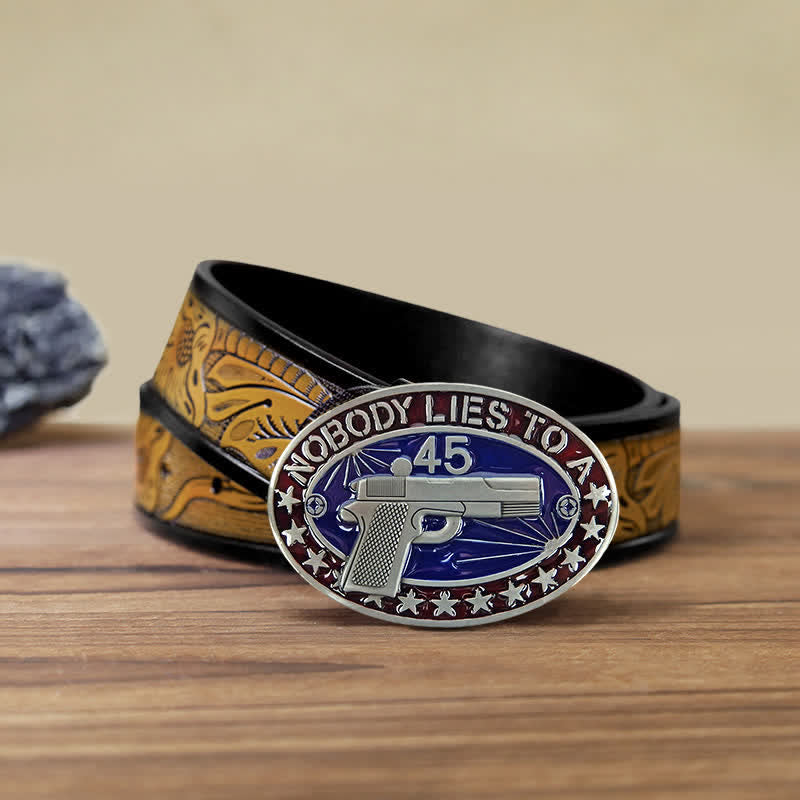 Esta exclusiva hebilla de cinturón de pistola vintage presenta esmalte rojo y azul, hay un tono metálico con una ingeniosa frase "Nadie le miente a un 45" en la parte superior de la hebilla.