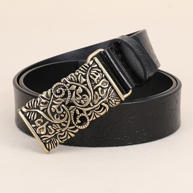 Cinturón de cuero con hebilla de flor hueca en relieve retro para mujer