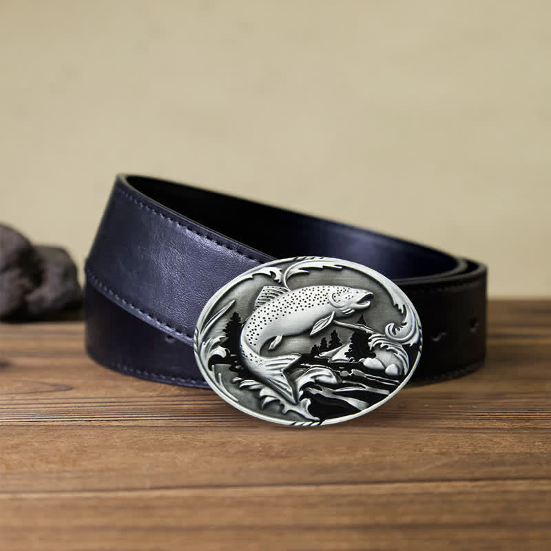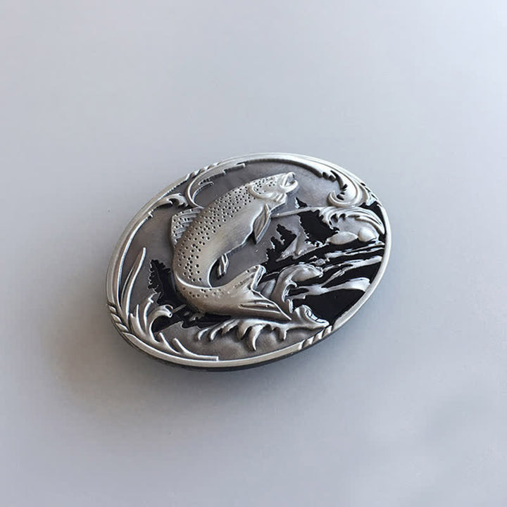 Hebilla ovalada con una gran trucha saltando en un arroyo de montaña. Su elegante diseño la convierte en la opción perfecta para destacar entre la multitud.
