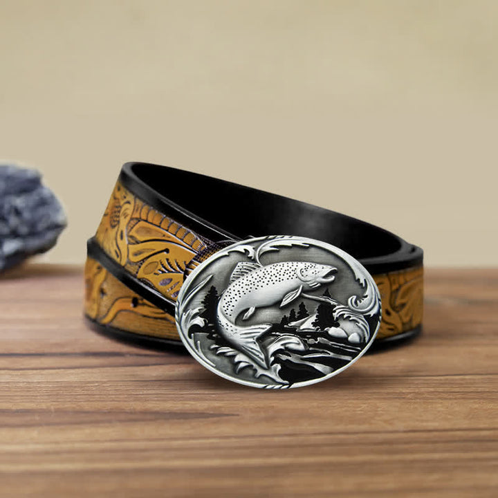 Cinturón de cuero con hebilla de pesca y vida silvestre para hombre hecho a mano