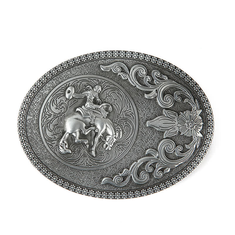 Un caballo al galope con su jinete, pergamino de influencia occidental con borde de cuerda sobre una hebilla ovalada de color plata antigua. Es un adorno perfecto para su atuendo o accesorio para complementar cualquier atuendo de manera absolutamente sencilla.