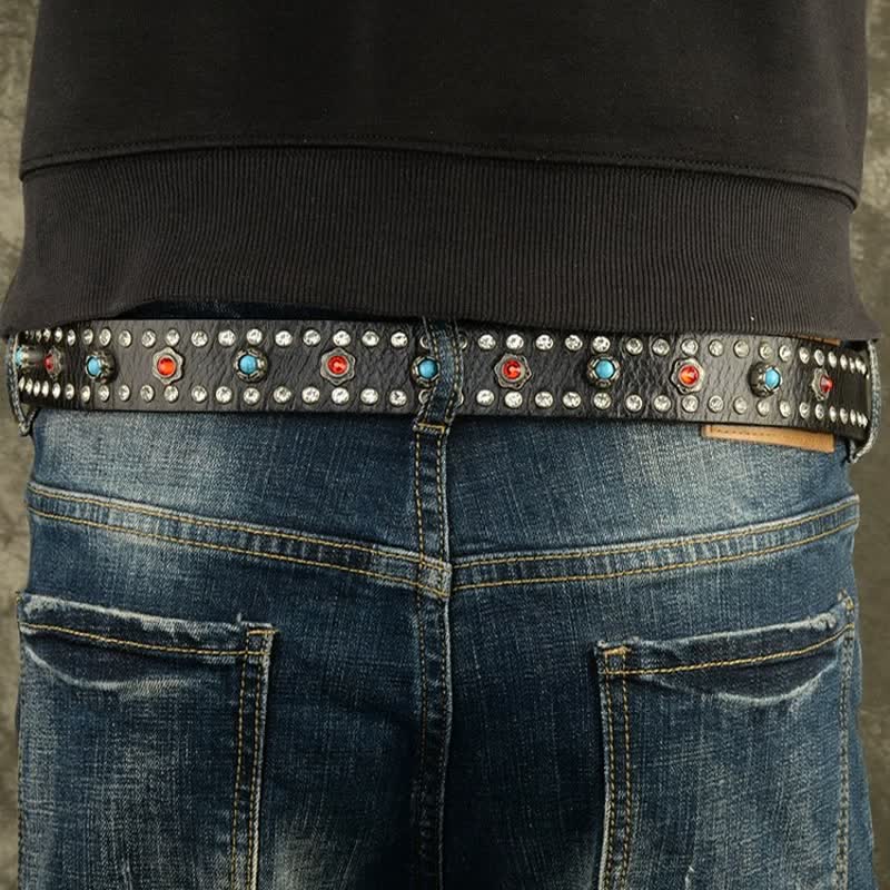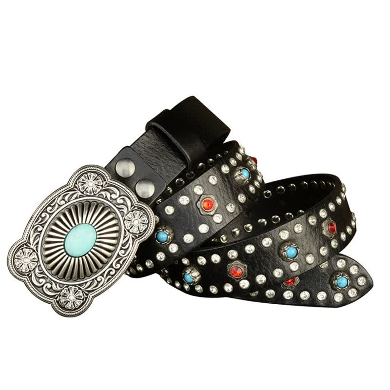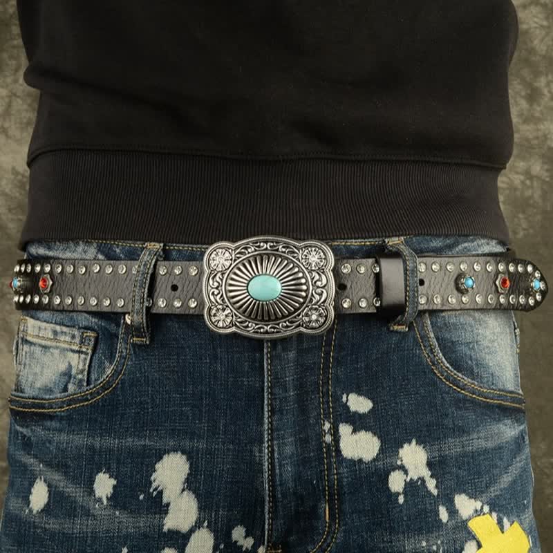 Funcionalidad y carácter se combinan en este colorido cinturón estilo western decorado con piedras. Presenta una hebilla metálica rectangular con una gran piedra turquesa sintética en el centro, que crea un contraste impactante con la correa de cuero de color neutro.