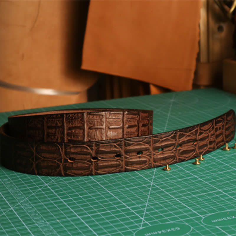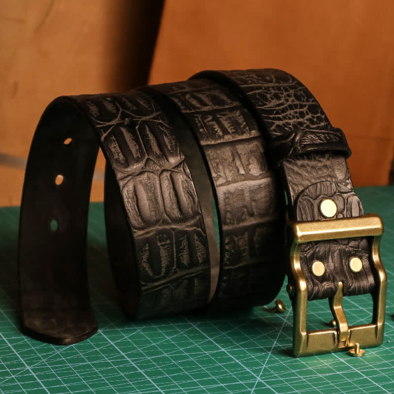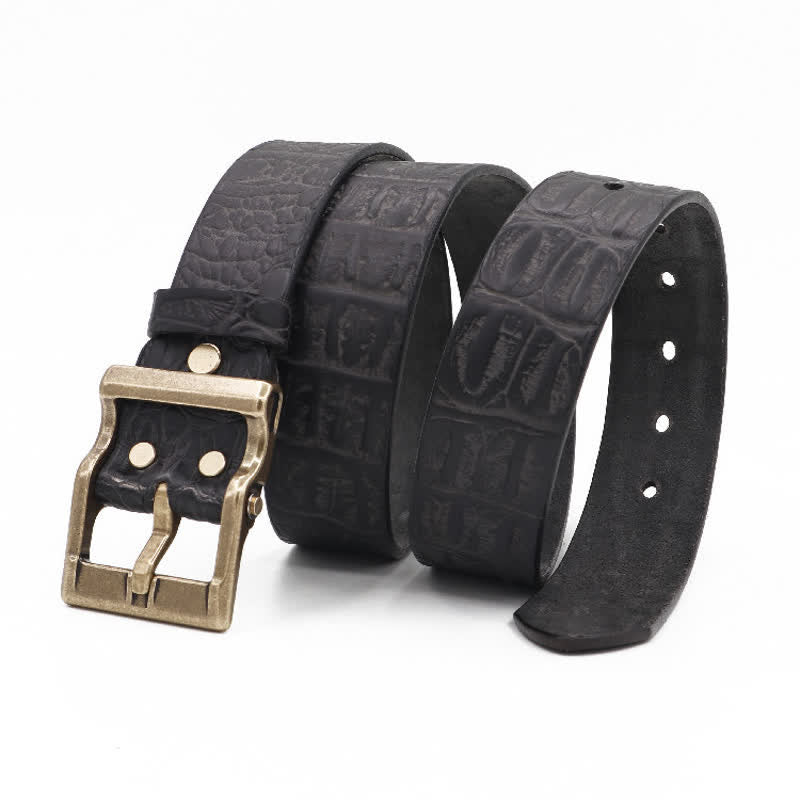 Este cinturón de estilo retro presenta un estampado de piel de cocodrilo en relieve, lo que lo hace llamativo y le da un estilo vintage. Este accesorio agrega el toque perfecto a cualquier par de pantalones.