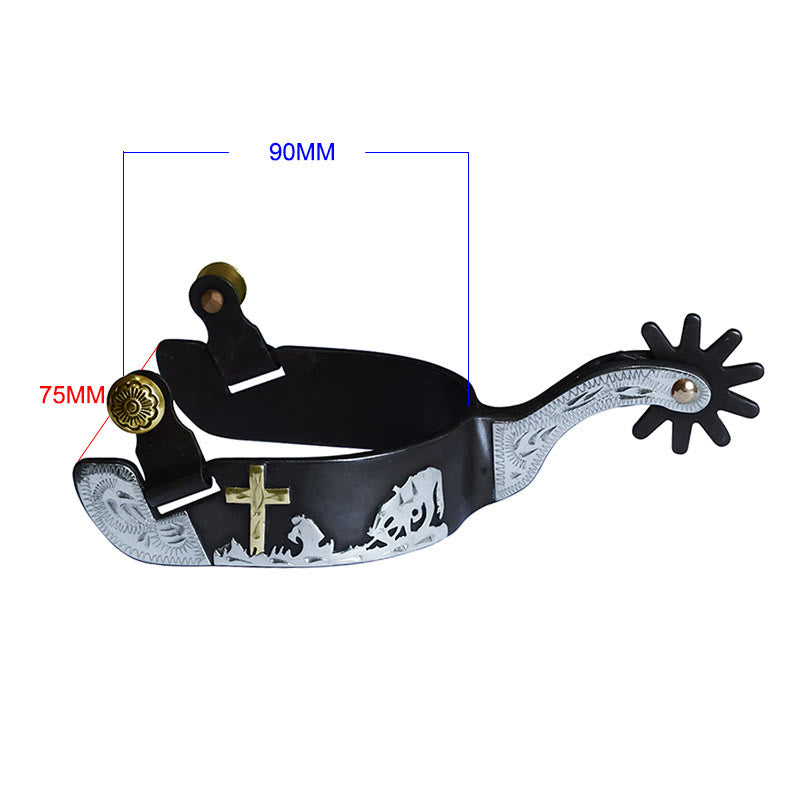 - Cada espuela está cuidadosamente elaborada con metal de alta calidad, adornada con detalles de cobre blanco y presenta patrones de cruces tallados a mano, rindiendo homenaje a la tradición con un impacto visual audaz.
