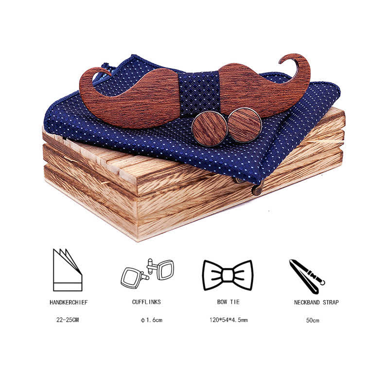 • El conjunto incluye: pajarita de madera, pañuelo y gemelos con caja de regalo de madera.