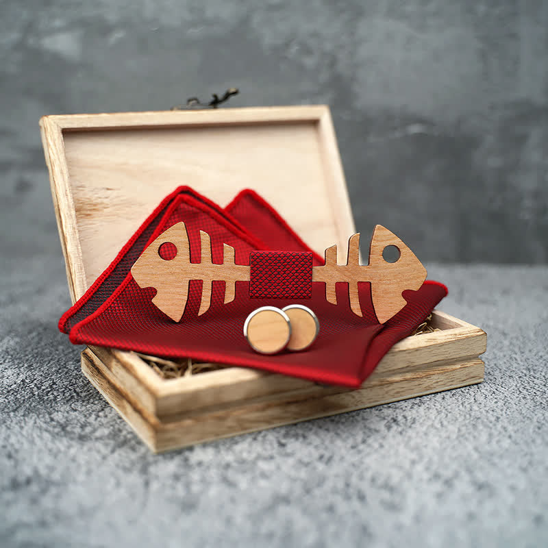 - El conjunto incluye: pajarita de madera, pañuelo y gemelos con caja de regalo de madera.