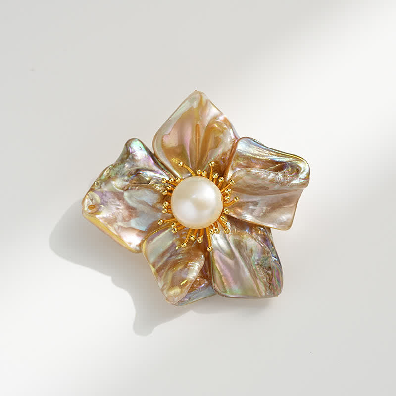 - Los pétalos están hechos de elementos de concha y el centro del broche está acentuado con perlas de agua dulce.