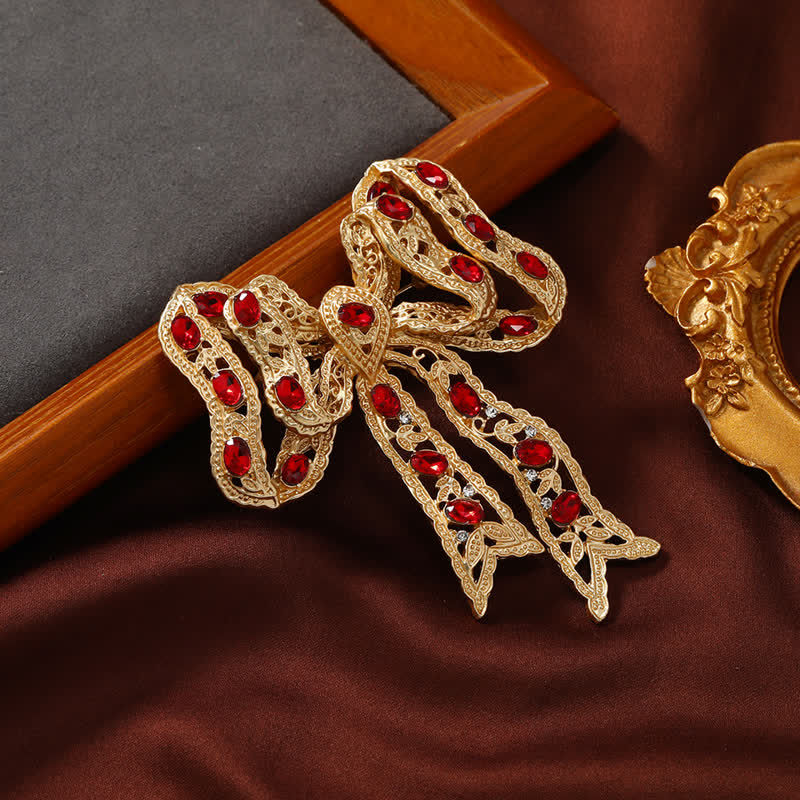- Presenta un diseño de lazo de cinta metálica elegantemente ondulado acentuado con un llamativo detalle de piedra roja.