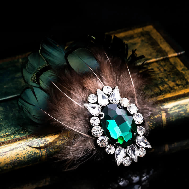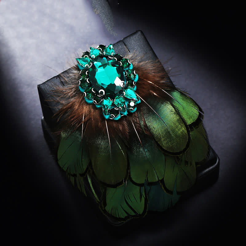 - Elegante y natural broche de plumas verde oscuro, accesorios de diamantes de imitación cosidos a mano.