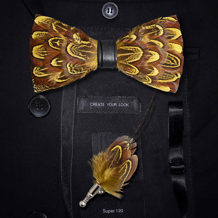 - Características: La pajarita de plumas de faisán combina distintos tonos de amarillo, almendra y sombra con toques de negro. Con capas de auténticas plumas de faisán, este diseño es elegante y rústico.