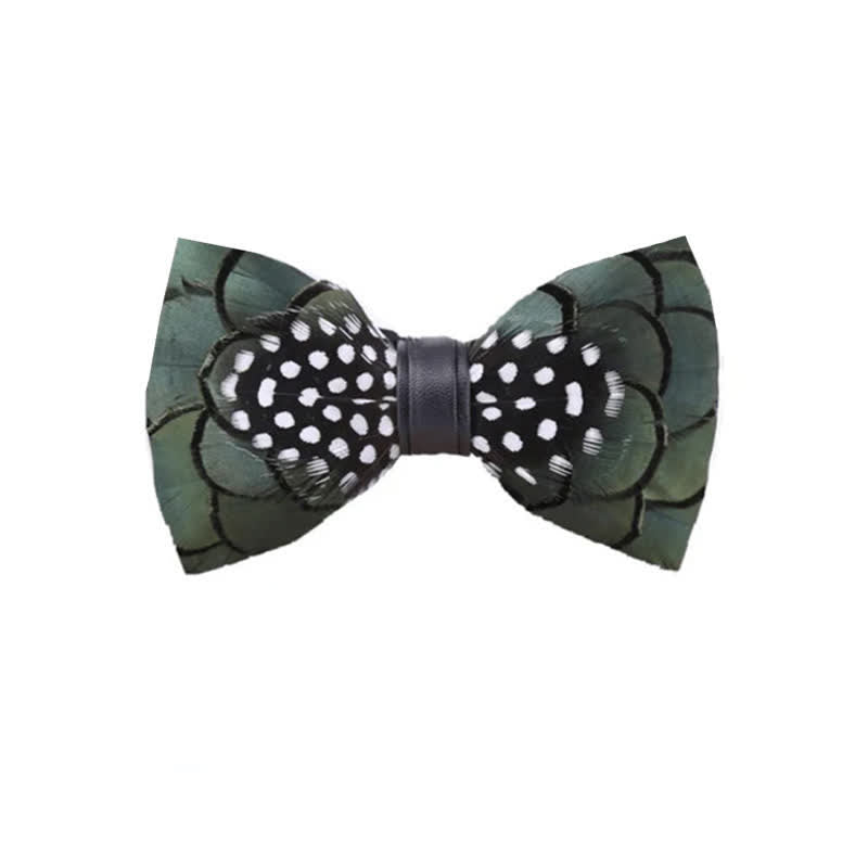 - Características: La pluma de tono verde con bordes negros es un tono apagado. Un poco elegante, un poco clásico, resalta sutiles plumas de faisán verde azulado con la característica pluma de guinea.