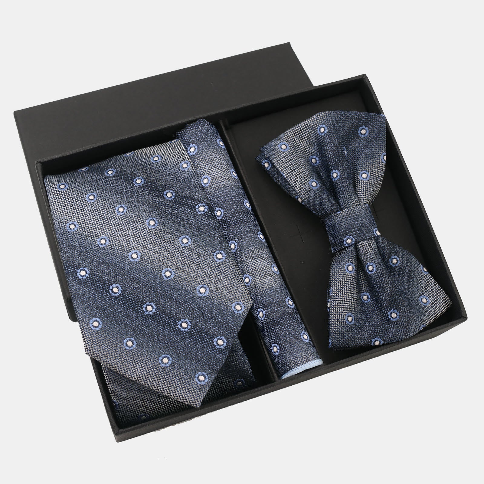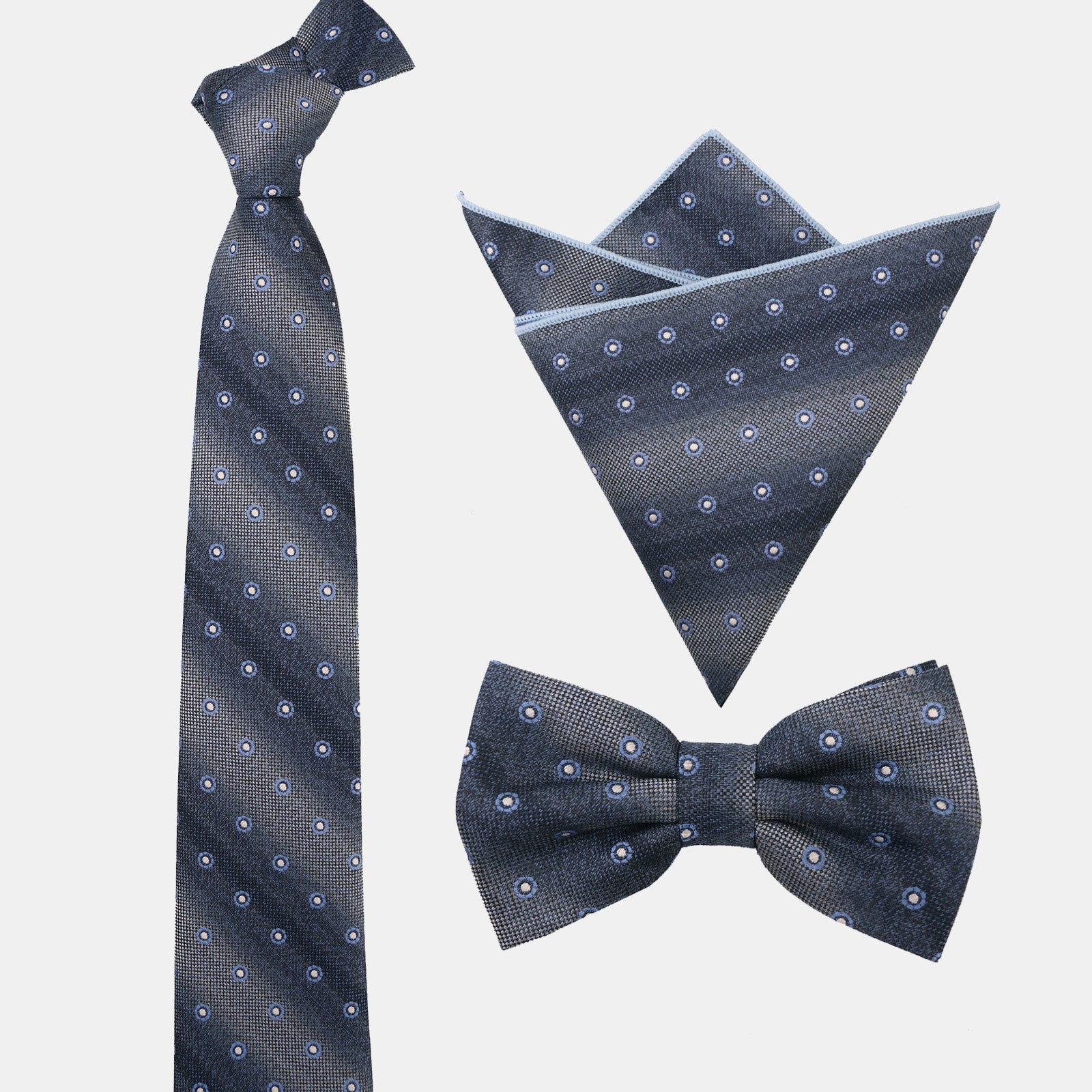 • El conjunto incluye una corbata, una pajarita y un pañuelo de bolsillo, todos diseñados con detalles consistentes para una apariencia elegante;