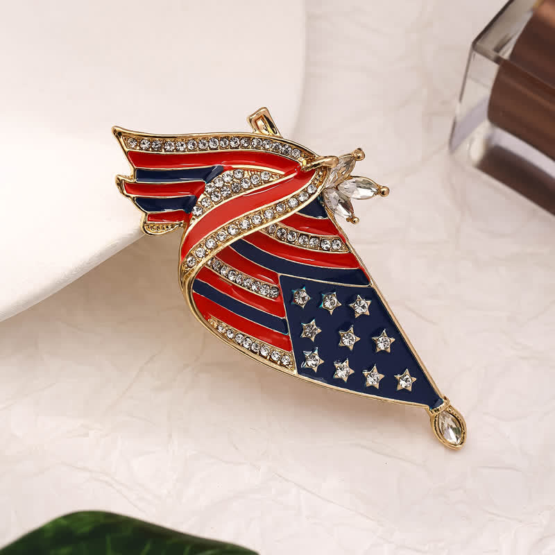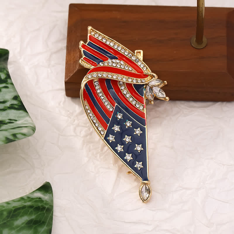 - Este broche simbólico presenta esmalte rojo, azul y blanco brillante adornado con piedras preciosas brillantes.